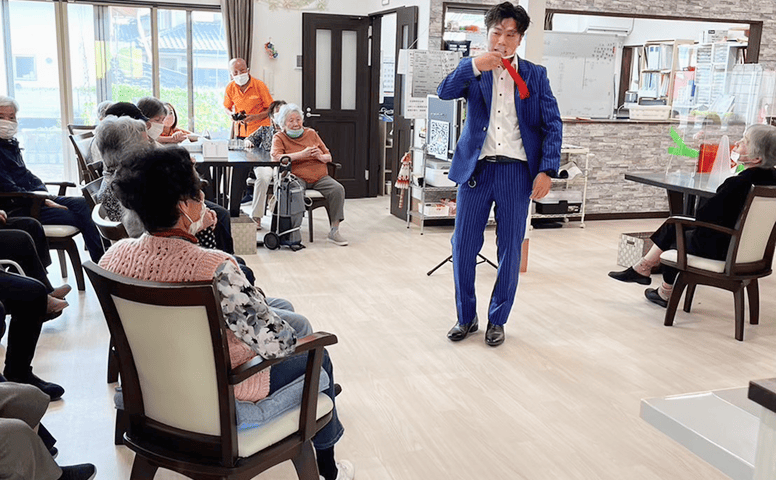 この度、ご縁があり、しょうごさんにデイサービスへお越しいただきました。 最初に、イベントでしょうごさんのマジックショーを拝見し、その圧倒的なパフォーマンスに魅了されました。とにかく楽しい!それが第一印象です。マジックの技術はもちろん、 会場全体を巻き込む雰囲気づくりが素晴らしく、「ぜひうちのデイサービスにも来てほしい!」と思い、依頼させていただきました。