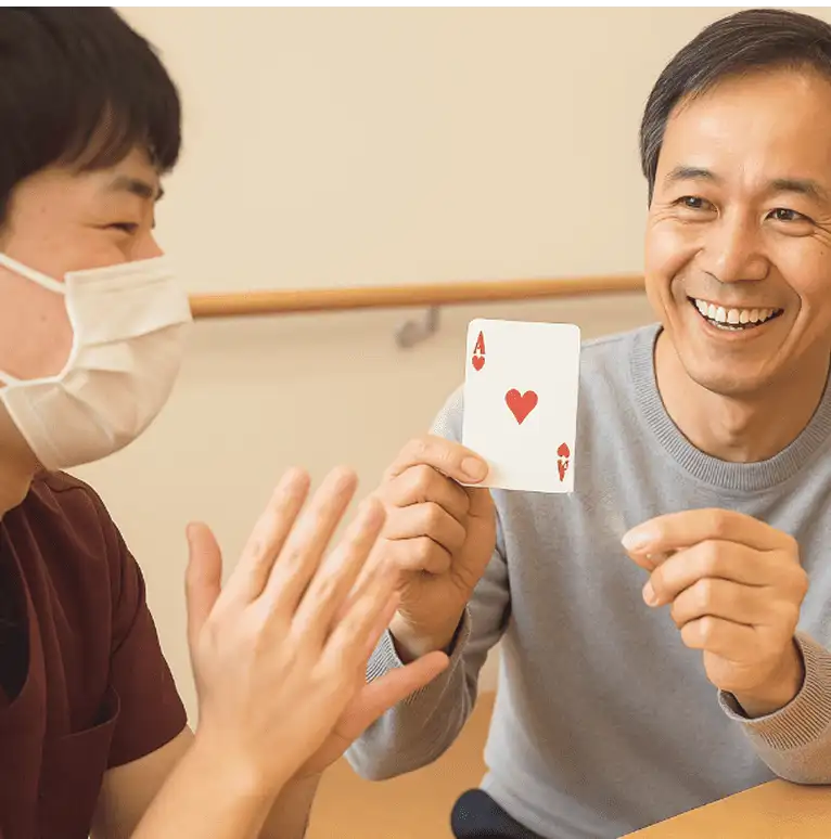 マジックを通じて笑顔や交流が生まれ、治療やリハビリのモチベーションを自然と高めることができます。 たとえば、手指のリハビリでは、反復運動が多く、飽きてしまうことがあります。 しかし、マジックでは「見せる楽しさ」が加わるため、トレーニングが自然と楽しい体験に変わります。また、周囲との会話や交流のきっかけになり、 孤独感を和らげる効果も期待できます。