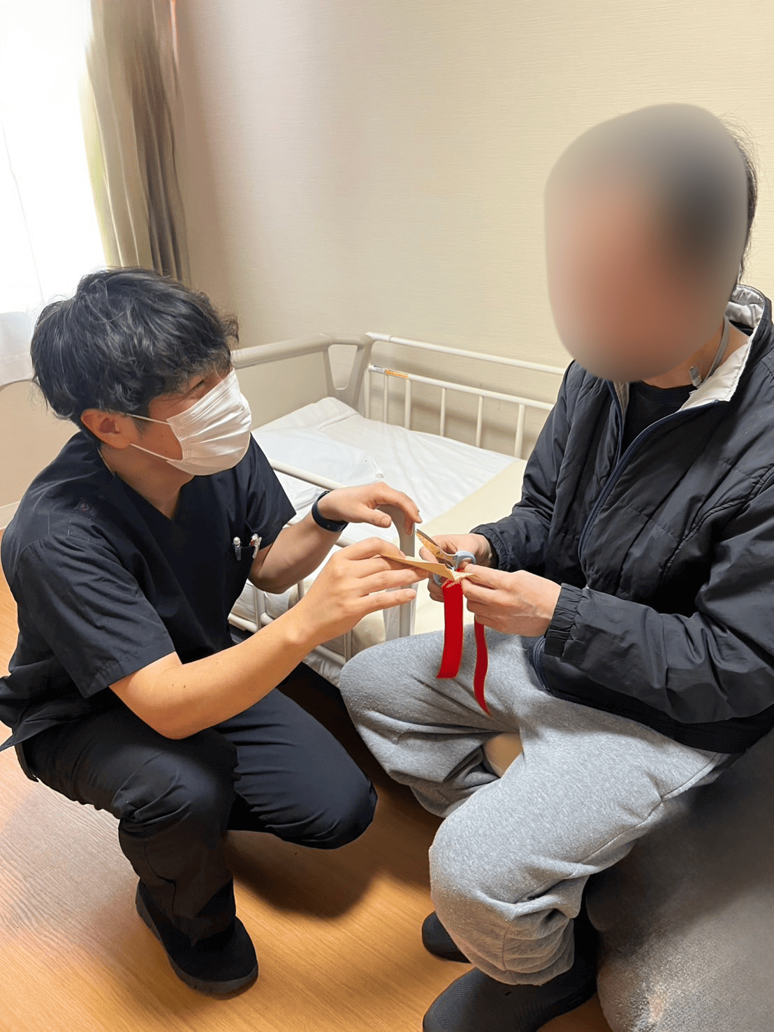 次に挑戦した切れないリボンマジックでは、封筒をつまむことや、はさみを使う動作に苦労しましたが、紙を切る練習を重ねるうちに、少しずつ感覚を取り戻していきました。